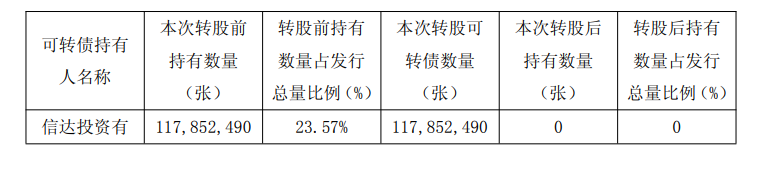 2025年6月27日,浦发银行公告,公司收到信达投资有限公司(以下简称“信达投资”)的通知,信达投资将其持有的 1.1785亿张浦发转债转为公司A 股普通股。该次可转债转股导致其持有的浦发转债减少量占浦发转债发行总量的23.57%。