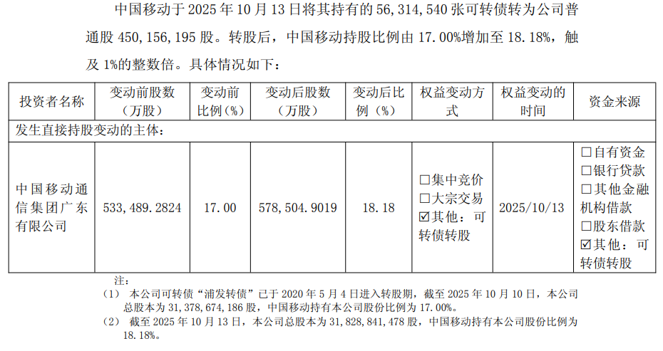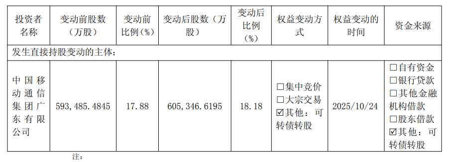而2025年10月24日,中国移动将其持有的1483.828万张可转债转为公司普通股1.186亿股。转股后,中国移动持股比例由17.88%增加至 18.18%,触及 1%的整数倍,触发公告。