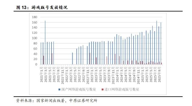 2025年10月共发放国产游戏版号159款,环比增加14款,同比增加46款;发放进口游戏版号7款,同比减少8款,环比减少4款。2025年1-10月共发放国产游戏版号1354款,同比增加274款,发放进口游戏版号87款,同比减少4款。