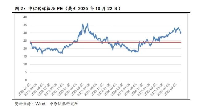 截至2025年10月22日,传媒板块PE(ttm,整体法,剔除负值)为30.39倍,2022年以来板块平均市盈率24.07倍,中位数23.34倍,最大值35.98倍,最小值16.46倍,当前PE历史分位为89.50%。