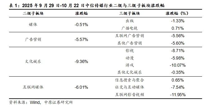 2025年9月29日-10月22日之间,传媒板块下跌6.65%,同期沪深300与上证指数分别上涨0.93%和2.24%,创业板下跌2.93%,传媒板块跑输沪深300、上证指数、创业板指7.58pct、8.88pct和3.72pct。