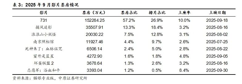 2025年9月票房排名前三的影片分别是《731》《捕风追影》《浪浪山小妖怪》,单月票房分别为15.23亿元、3.55亿元、2.00亿元,票房占比分别为57.2%、13.3%、7.5%,排片占比分别为26.9%、18.4%、12.8%。