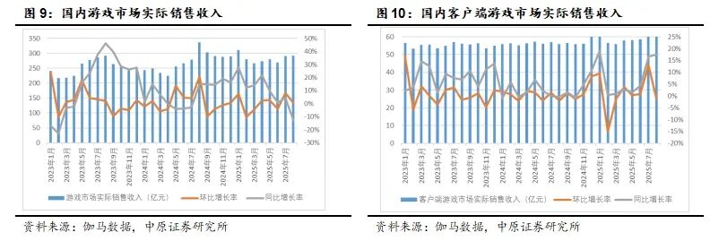 2025年1-8月国内游戏市场销售收入2263.47亿元,同比增长8.45%;移动游戏市场销售收入1682.20亿元,同比增长11.27%;客户端游戏市场销售收入486.03亿元,同比增长7.91%,自主研发游戏海外实际销售收入128.74亿美元,同比增长7.10%。