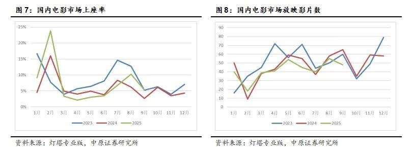 2025年9月,国内电影市场票房26.62亿元,同比增加82.83%,环比减少55.57%;观影人次7151.67万,同比增长98.61%,环比减少56.67%;平均票价37.33元,同比减少7.95%,环比提升2.54%;放映场次1115.5万场,同比减少2.47%,环比减少11.94%;整体上座率5.3%,同比提升2.7pct,环比下滑4.9pct。