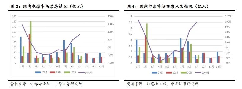 2025年1-9月国内电影市场总票房419.52亿元,同比增加20.66%,观影人次9.86亿,同比增加20.77%。