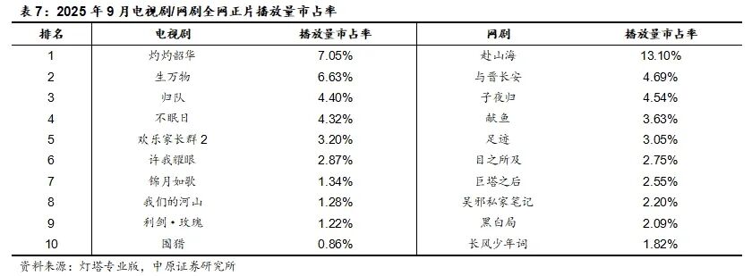 根据灯塔专业版统计的2025年9月全网正片播放量,电视剧排名前五的分别是《灼灼韶华》《生万物》《归队》《不眠日》《欢乐家长群2》;网剧排名前五的分别是《赴山海》《与晋长安》《子夜归》《献鱼》《足迹》。