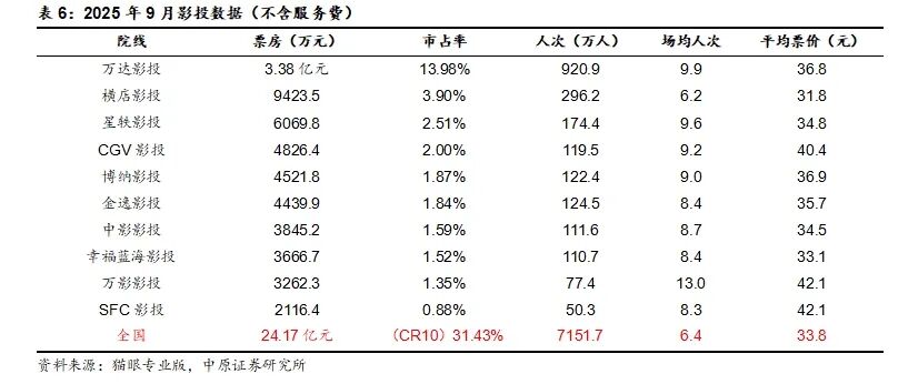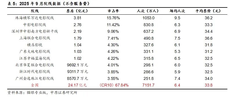 2025年9月,珠海横琴万达电影院线票房3.81亿元,市场占有率15.76%,环比持平;中影电影院线票房2.76亿元,市场占有率11.42%,环比提升0.35pct;深圳市中影南方电影新干线票房2.19亿元,市场占有率9.06%,环比下滑0.43pct。