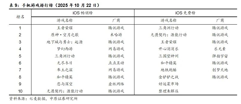 根据七麦数据统计的2025年10月22日iOS畅销榜游戏排行中,《王者荣耀》《原神》《地下城与勇士:起源》《梦幻西游》《三角洲行动》排名前五。iOS免费榜中,《三角洲行动》《无畏契约:源能行动》《王者荣耀》《开心消消乐》《三国望神州》排名前五。