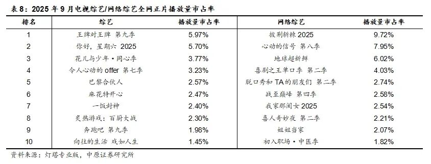 根据灯塔专业版统计的2025年9月全网正片播放市占率,电视综艺排名前五的分别是《王牌对王牌 第九季》《你好,星期六 2025》《花儿与少年·同心季》《令人心动的offer 第七季》《巴黎合伙人》;网络综艺排名前五的分别是《披荆斩棘2025》《心动的信号 第八季》《地球超新鲜》《喜剧之王单口季 第二季》《脱口秀和TA的朋友们 第二季》。