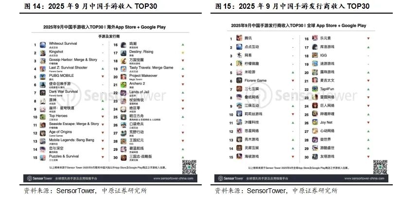 根据SensorTower数据显示,2025年9月中国手游收入TOP30中,《Whiteout Survival》《Kingshot》《Gossip Harbor: Merge& Story》《Last Z:Survival Shooter》《PUBG MOBILE》排名前五。
