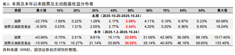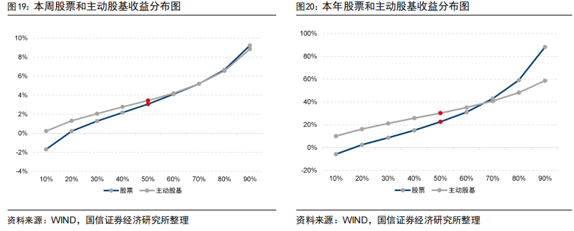 图19和图20展示了全部A股股票(剔除上市不满半年的新股及ST股)、主动股基在本周及本年的收益率分布图,描述了不同分位点下的资产收益率。