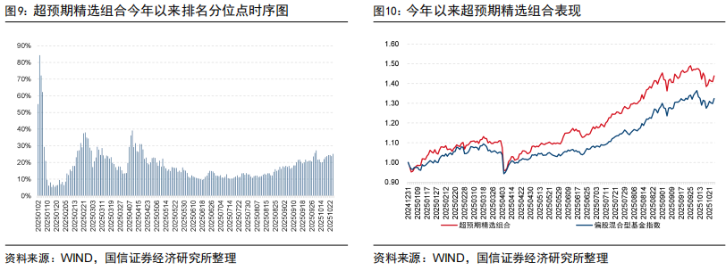 图9展示了超预期精选组合本年以来在主动股基中的排名分位点时间序列图。图10展示了今年以来超预期精选组合与偏股混合型基金指数的净值走势。本年偏股混合型基金指数收益率32.39%,超预期精选组合收益率43.86%。