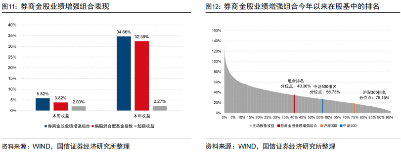 本周,券商金股业绩增强组合绝对收益5.82%,相对偏股混合型基金指数超额收益2.00%。本年,券商金股业绩增强组合绝对收益34.66%,相对偏股混合型基金指数超额收益2.27%。今年以来,券商金股业绩增强组合在主动股基中排名40.36%分位点(1400/3469)。