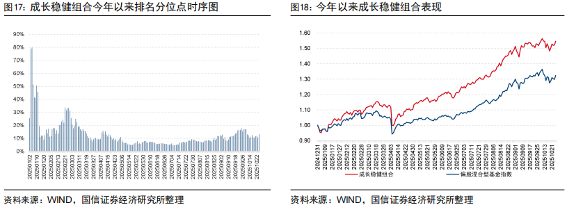 本年(2025.1.2-2025.10.24),成长稳健组合绝对收益54.64%,相对偏股混合型基金指数超额收益22.26%。今年以来,成长稳健组合在主动股基中排名13.12%分位点(455/3469)。
