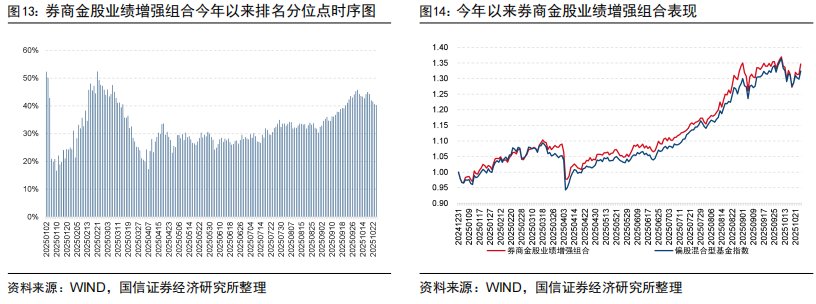 图13展示了券商金股业绩增强组合本年以来在主动股基中的排名分位点时间序列图。图14展示了今年以来券商金股业绩增强组合与偏股混合型基金指数的净值走势。本年偏股混合型基金指数收益率32.39%,券商金股业绩增强组合收益率34.66%。
