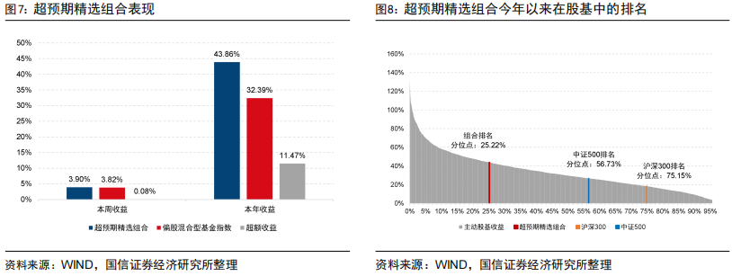 本周,超预期精选组合绝对收益3.90%,相对偏股混合型基金指数超额收益0.08%。本年,超预期精选组合绝对收益43.86%,相对偏股混合型基金指数超额收益11.47%。今年以来,超预期精选组合在主动股基中排名25.22%分位点(875/3469)。