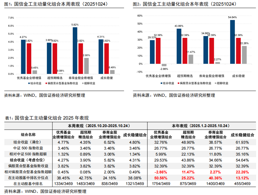 本周(2025.10.20-2025.10.24),券商金股业绩增强组合绝对收益5.82%,相对偏股混合型基金指数超额收益2.00%。