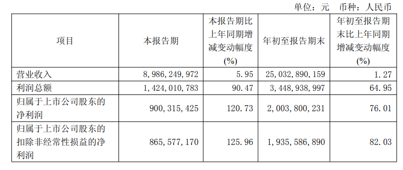 归属于上市公司股东的净利润为20.04亿元,同比增长76.01%。归属于上市公司股东的扣除非经常性损益的净利润为19.36亿元,同比增长82.03%。基本每股收益为0.97元。