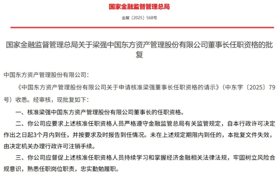 近日,金监总局批复,核准梁强中国东方资产管理股份有限公司董事长的任职资格。54岁的梁强正式掌舵中国第二大金融资产管理公司,面临的挑战和难度不亚于彼时执掌中国华融。