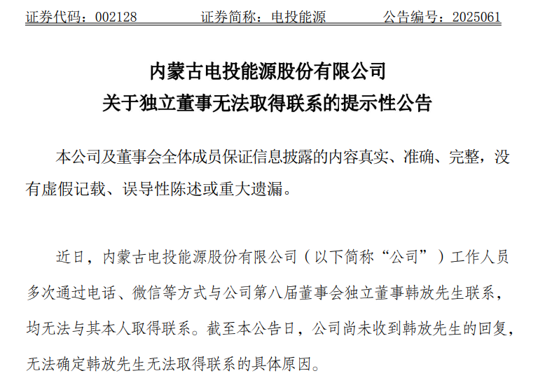 10月23日晚间,国家电力投资集团旗下的电投能源发布公告称,近日,公司工作人员多次通过电话、微信等方式与公司第八届董事会独立董事韩放联系,均无法与其本人取得联系。截至公告日,公司尚未收到韩放的回复,无法确定韩放无法取得联系的具体原因。