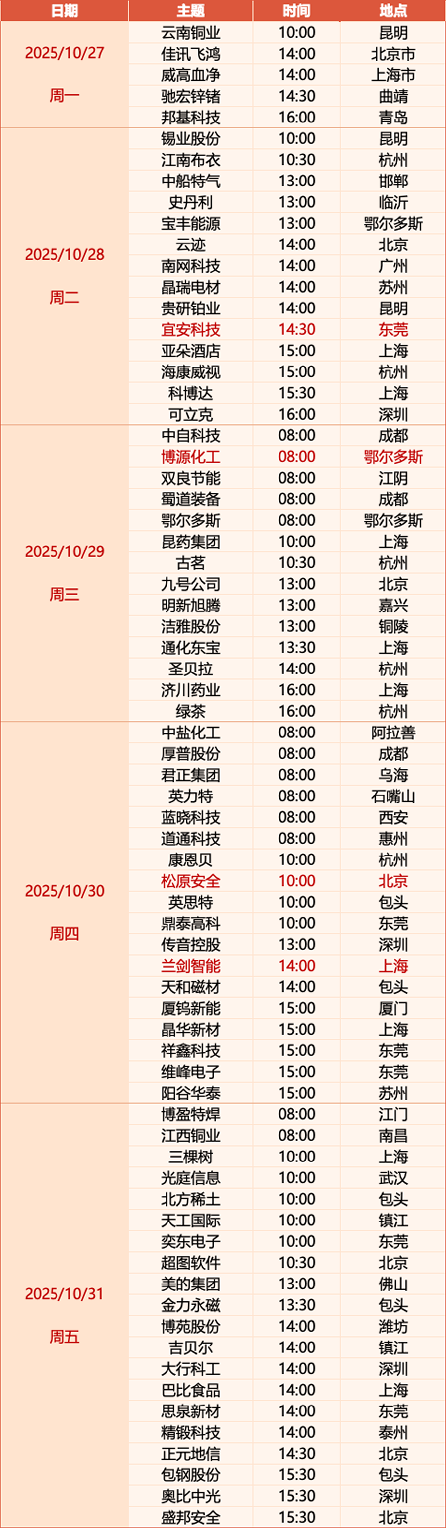 从整体调研趋势来看,下周调研呈现“区域聚焦核心城市、行业紧扣市场热点”的特点。北京、上海、杭州、深圳等经济活跃、产业基础雄厚的城市成为调研核心区域,便于深入了解企业实际运营情况;行业上,有色金属、科技、消费、医疗健康等领域被重点覆盖,契合当前市场对这些领域发展前景的关注。