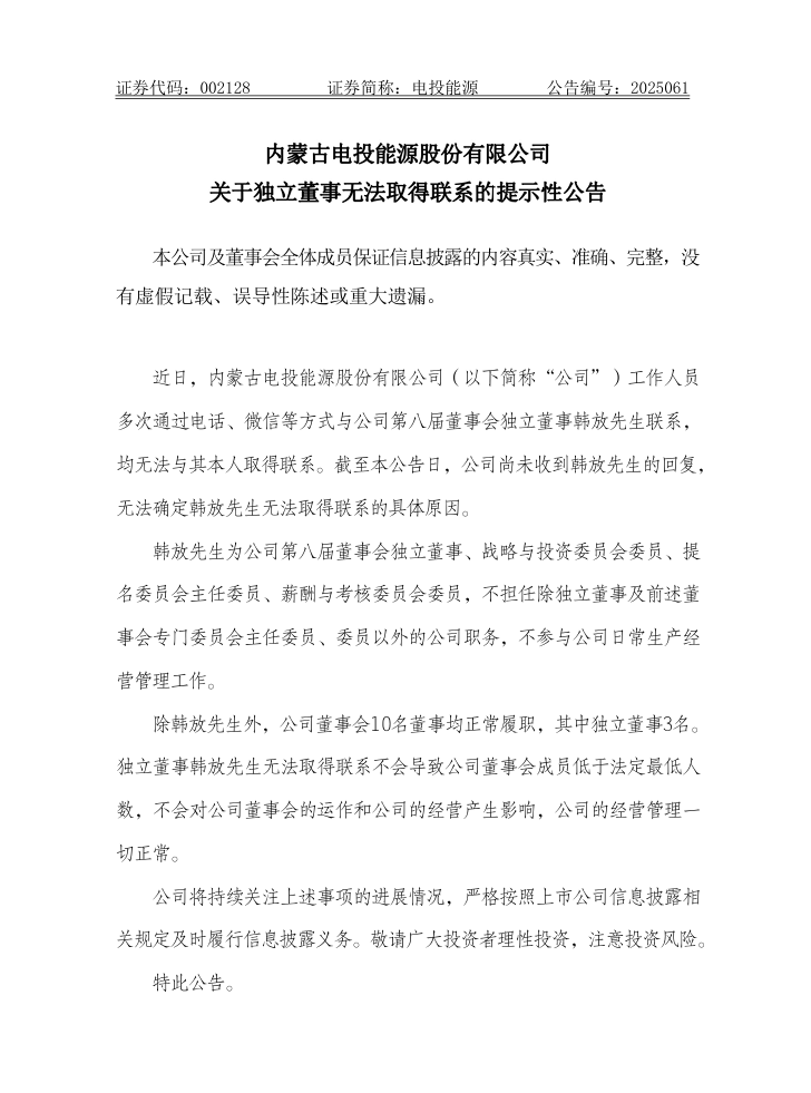 电投能源表示,除韩放先生外,公司董事会10名董事均正常履职,其中独立董事3名。独立董事韩放先生无法取得联系不会导致公司董事会成员低于法定最低人数,不会对公司董事会的运作和公司的经营产生影响,公司的经营管理一切正常。