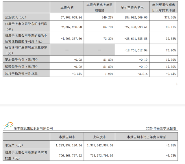 荣丰控股10月26日发布三季度报告。公告显示,公司前三季度营业收入184992309.06元,同比增加377.55%,归属上市公司股东的净利润-27403998.51元。