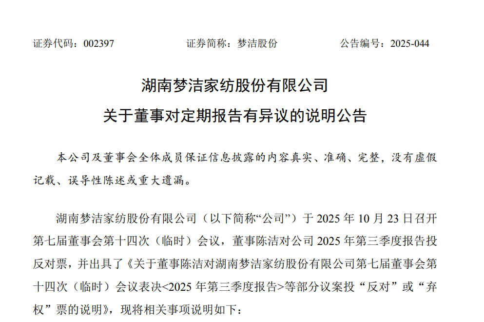 同日,梦洁股份公告称,公司于2025年10月23日召开第七届董事会第十四次(临时)会议,董事陈洁对公司2025年第三季度报告投反对票。董事陈洁无法保证公司《2025年第三季度报告》真实、准确、完整、不存在虚假记载、误导性陈述或重大遗漏。