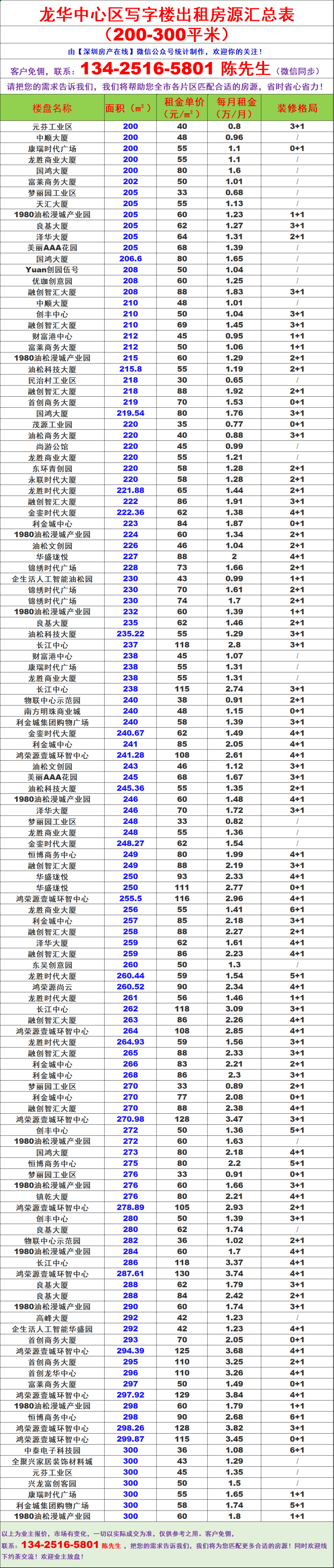 龙华中心区写字楼办公室出租房源信息表&租金价格表