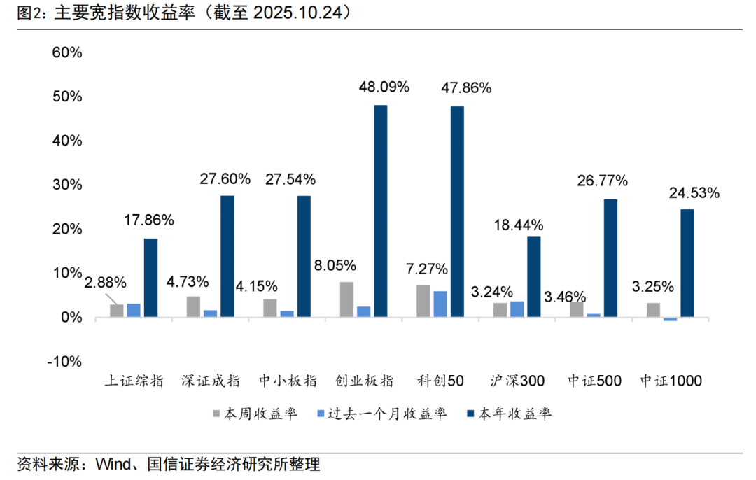 近期美国通胀数据低于预期,进一步巩固了市场对美联储年内继续降息的预期。流动性预期改善为股市提供了强劲支撑,推动纳指和标普500在10月24日齐创新高。上周纳斯达克100指数上涨2.18%,年内收益20.68%;标普500指数上涨1.92%,年内收益15.47%。