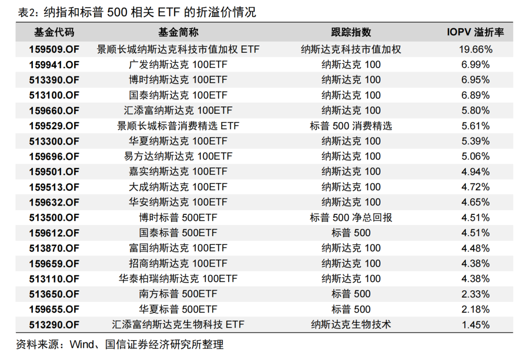 从场内ETF情况来看,截至2025年10月24日,纳指和标普500相关ETF均出现了不同程度的溢价,其中景顺长城纳斯达克科技市值加权ETF溢价高达19.66%,其余ETF的溢折率平均为4.73%。这也说明了场外QDII额度荒的情况正通过ETF的溢价显现。