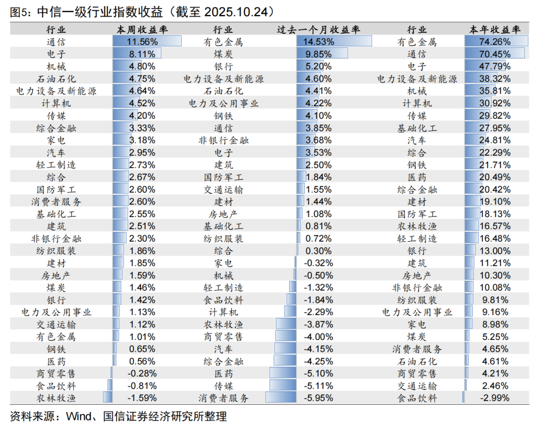 行业方面,上周通信、电子、机械收益靠前,收益分别为11.56%、8.11%、4.8%,农林牧渔、食品饮料、商贸零售收益靠后,收益分别为-1.59%、-0.81%、-0.28%。过去一个月,有色金属行业累计上涨14.53%,收益最高,消费者服务行业累计下跌5.95%,收益最低。今年以来,有色金属、通信、电子的累计收益较高,分别为74.26%、70.45%、47.79%,相比之下,食品饮料、交通运输等多个行业的收益率最低。