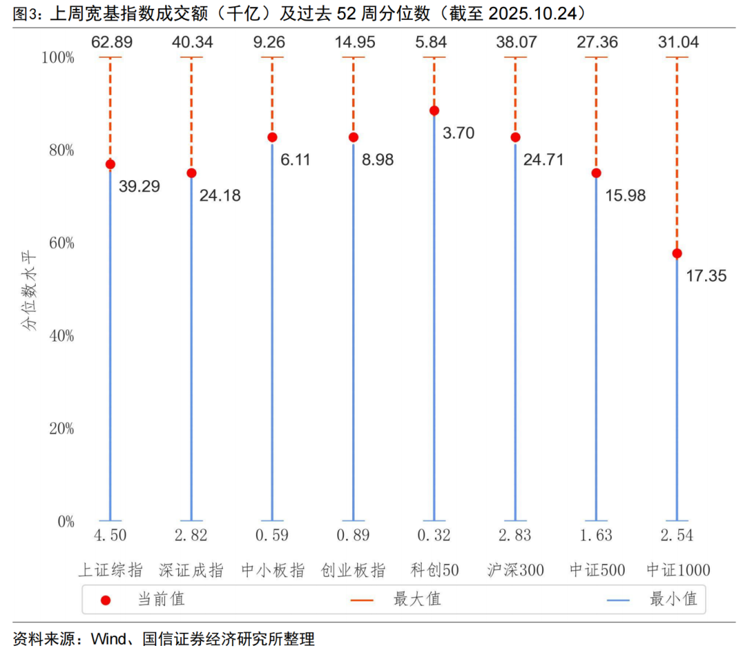 从成交额来看,上周主要宽基指数成交额均有所下降,在过去52周的样本期内,主要宽基指数均位于55%-90%的历史分位水平。