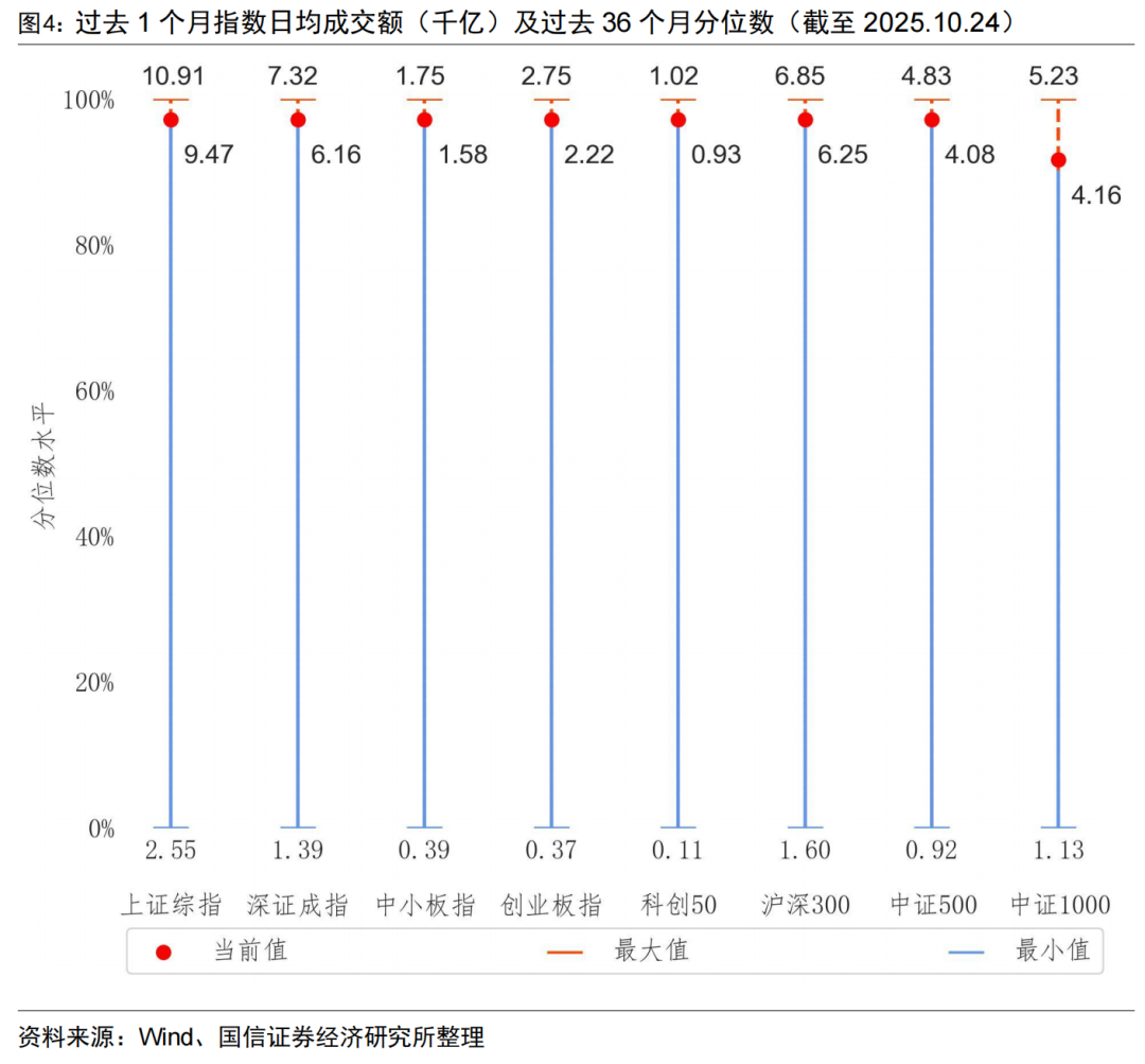 按月度来看,过去一个月主要宽基指数的日均成交额均有所下降,主要宽基指数均位于过去36个月90%-100%的历史分位水平。
