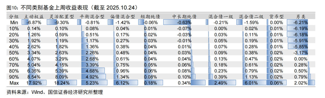 上周主动权益、灵活配置型、平衡混合型基金收益分别为3.34%、2.63%、2.26%。今年以来另类基金业绩表现最优,中位数收益为29.89%,主动权益型、灵活配置型和平衡混合型基金的中位数收益分别为29.48%、22.25%、14.14%。