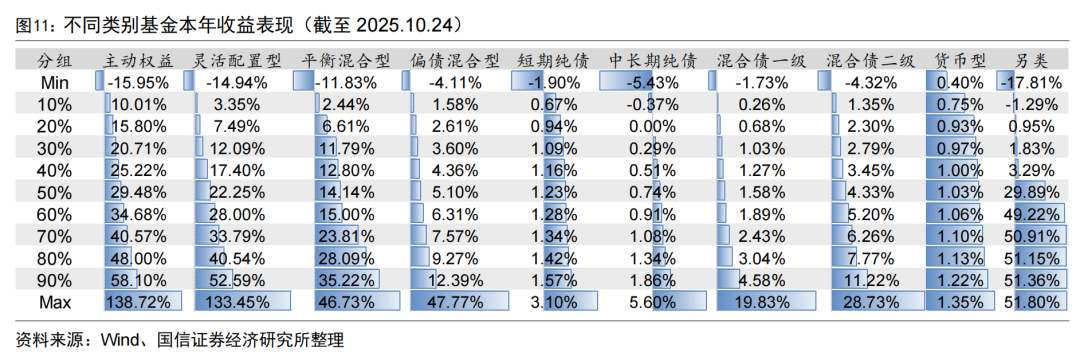 今年以来另类基金业绩表现最优,中位数收益为29.89%,主动权益型、灵活配置型和平衡混合型基金的中位数收益分别为29.48%、22.25%、14.14%。