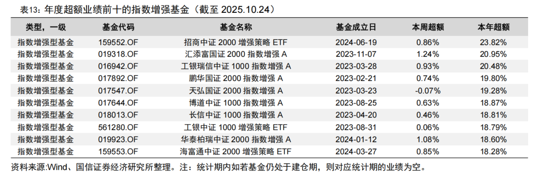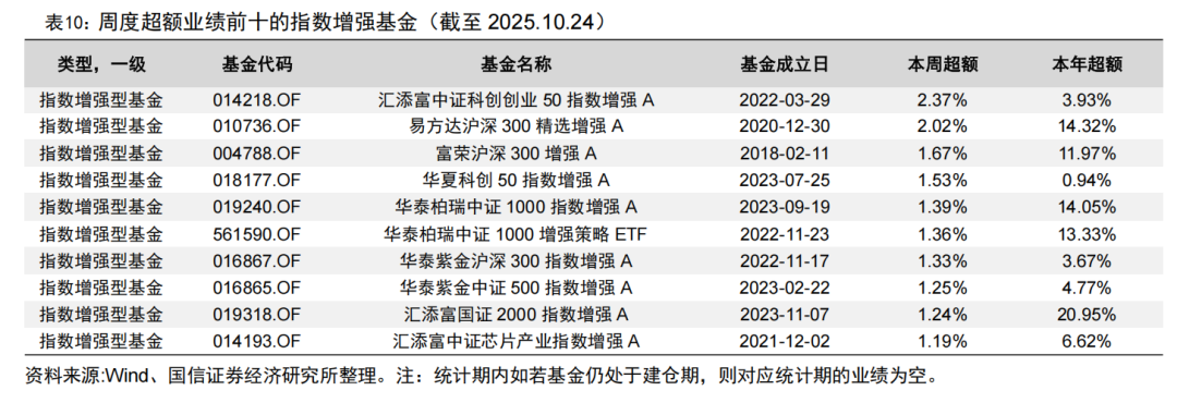 统计指数增强基金相对基准的超额收益和量化对冲型基金的收益情况,新成立基金在6个月建仓期满之后才参与统计。上周指数增强基金超额收益中位数为0.17%,量化对冲型基金收益中位数为0.28%。今年以来,指数增强基金超额中位数为4.18%,量化对冲型基金收益中位数为1.08%。