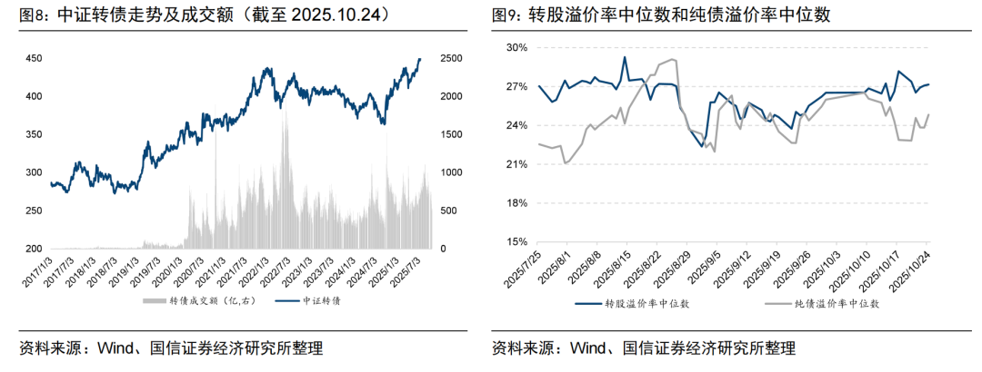 上周中证转债指数上涨1.47%,累计成交2793亿元,较前一周减少650亿元。截至上周五,可转债市场转股溢价率中位数为27.15%,较前一周减少1.02%,纯债溢价率中位数为24.82%,较前一周增加1.94%。