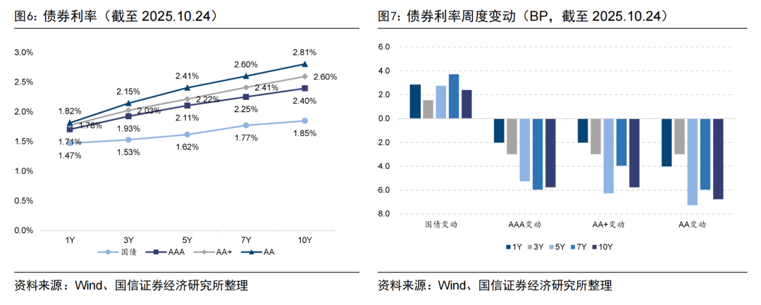 如下图所示,不同期限的国债利率均有所上行,利差缩窄0.42BP。不同期限不同评级的信用债利率均有所上行。