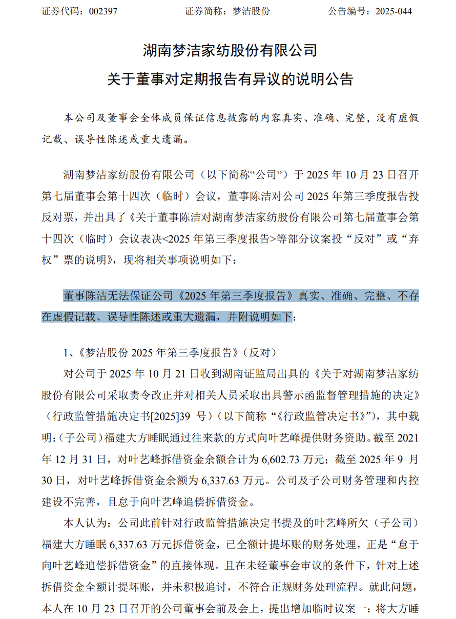 陈洁的反对理由直指两大核心问题,均有监管文件佐证。首先是6337万欠款的“糊涂账”,湖南证监局10月21日出具的《行政监管决定书》显示,子公司大方睡眠向叶艺峰提供的财务资助,截至2025年9月30日余额仍有6337.63万元,公司“怠于追偿”且内控不完善。
