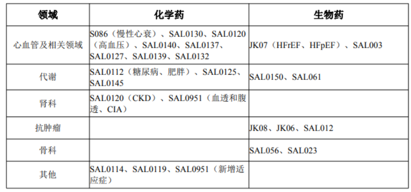 但其随着2019年“泰嘉事件”重大影响而加速向生物药布局,包括了心血管方向的JK07、SAL003,代谢的SAL0150、SAL061,抗肿瘤的JK08、JK06、SAL012,骨科的SAL056和SAL023。