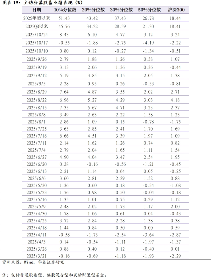 10月第3周(10.20-10.24)主动公募股基部分跑赢沪深300。其中10%、20%、30%和50%周度涨跌幅分别在8.4%、6.1%、4.8%、3.1%,沪深300周度上涨3.2%。