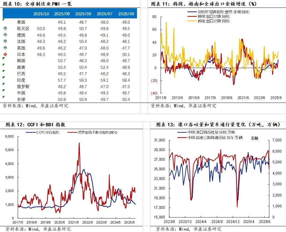 外需方面,涨跌互现。9月全球制造业PMI自50.9回落至50.8,主要经济体PMI多数下行。CCFI指数最新一周环比上涨2.02%。港口货物吞吐量回升。韩国9月出口增速升至12.7%,10月前20日降至-7.8 %。越南出口增速自8月的15.4%升至9月的25.3%。