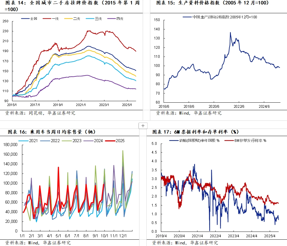内需方面,最新一周二手房价格下跌,数量指标涨跌互现。高速公路货车通行量回升, 2025年4月十行业拟合的产能利用率5-8月持续回升,9-10月持续回落。汽车成交量处于历史同期较高水平,新房成交持续处于历史最低,二手房成交相对历史季节性回落。截至10月19日,全国城市二手房挂牌价指数较上周环比下降0.21%。截至10月17日,生产资料价格指数较上周环比下跌0.2%。