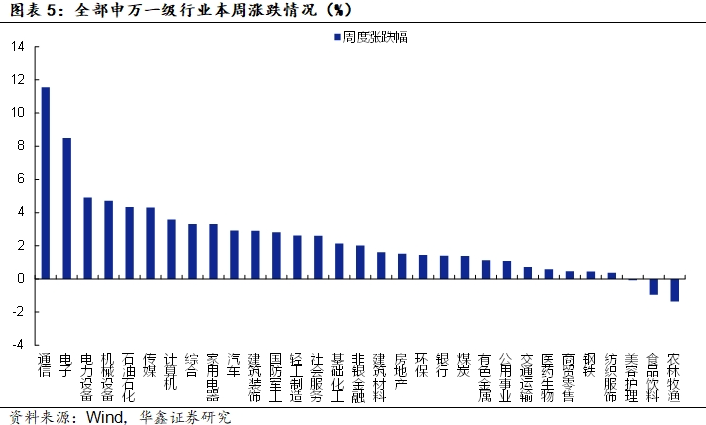 本周A股缩量上涨。上证指数涨2.9%,深证成指涨4.7%,创业板指涨8.1%。申万一级行业中通信、电子、电力设备、机械设备、石油石化涨幅最大,本周分别上涨11.5%、8.5%、4.9%、4.7%、4.3%,农林牧渔、食品饮料、美容护理跌幅最大,周涨跌幅分别在-1.4%、-0.9%、-0.1%。