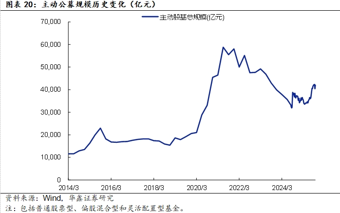 根据最新净值及份额估算,截至10月24日,主动公募股基资产净值在4.2万亿元,较2024Q4的3.66万亿元小幅上升。