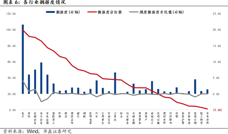 截至10月24日,拥挤度前五的行业为电子、电力设备、机械设备、计算机、通信,分别为21.6%、9.8%、7.6%、6.7%、6%。排名后五为美容护理、综合、纺织服饰、社会服务、钢铁,分别为0.2%、0.2%、0.6%、0.6%、0.6%。