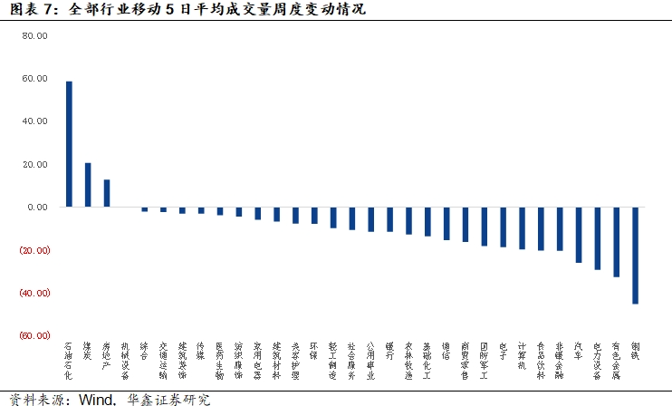 本周全A日均成交量1.8万亿元,较上周2.19万亿元下降。石油石化、煤炭、房地产、机械设备、综合成交量同比增速最高,成交量变动分别在58.5%、20.5%、12.7%、-0.1%、-2.1%。钢铁、有色金属、电力设备、汽车、非银金融成交量涨幅最小,成交量变动分别在-45.3%、-32.7%、-29.3%、-26%、-20.4%。
