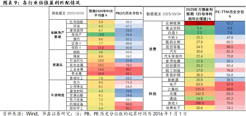 估值盈利匹配方面,截至2025年10月24日,2024年全年盈利预测较高,且当下估值相对历史偏低的行业有银行、保险、石油石化、交通运输、医药生物、美容护理、消费电子。