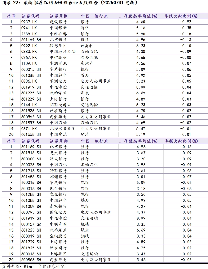 在缩表周期下,股债性价比偏向权益的幅度有限,风格上价值相对占优的概率更高。我们认为,红利类股票大体上应具备以下三个特征:不扩表,盈利好,活下来。综合以上三个特征,并结合公募四季报欠配情况,我们推荐的A+H红利组合包括A+H20只个股,A股组合包括A股20只个股,主要集中在银行、电信、石油石化、交通运输等行业,由于部分行业个股数量较多, 银行等行业个股进行适当精简。